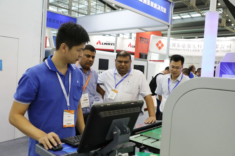 ▲技術(shù)人員為客戶講解PCB全自動(dòng)二維碼激光打標(biāo)機(jī)